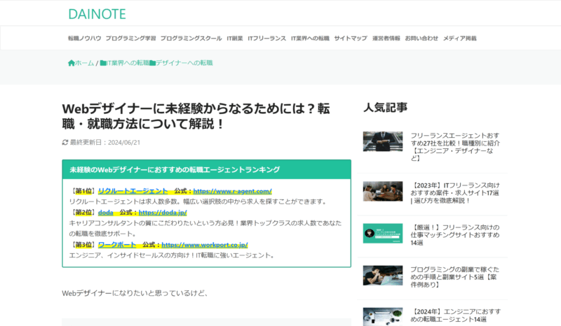 DAINOTEはIT系のキャリアを歩みたい方向けのライフスタイルメディアです。主にプログラミングやマーケティングの学習法や、IT副業、フリーランス、転職ノウハウを詳しく解説しています。
